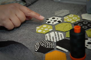 Maria viste også hvordan Hex N'More linealen fungerede og er her igang med en pude i Jaybird design med den nye kollektion vi lige har fået hjem "Imprint" fra Art Gallery