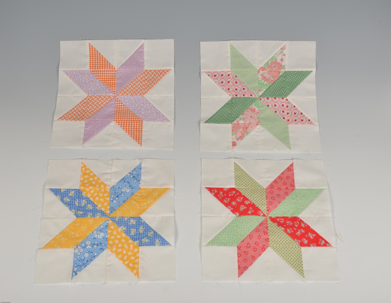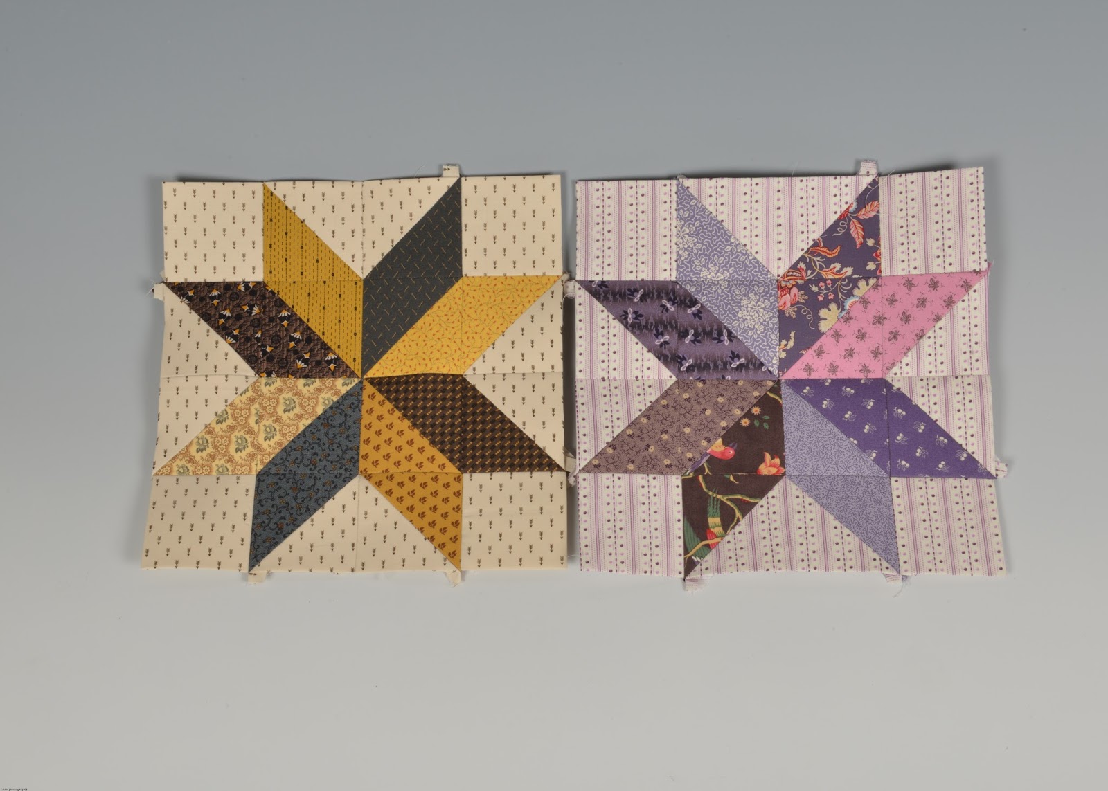 "Oldemor" versionen af denne BOM har shirtings baggrunde (forskellige) i alle 12 blokke og HVERT af hendes stjerneben har sin egen farve/stykke stof, altså 8 forskellige 1800-tals stoffer, der passer sammen, men stjernerne vil hver især være meget forskellige, som de 2 I kan se på billedet herover.