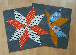 Stofferne til selve stjernen er MODERNE; hovedsagelig de meget hippe designs fra Cotton & Steel i fine farver, "krydret" med et par fede sort/hvide prints fra bl.a. Carolyn Friedlander og Victoria Findlay Wolfe. Hver stjerne består "kun" af 2 forskellige stoffer, der passer sammen.