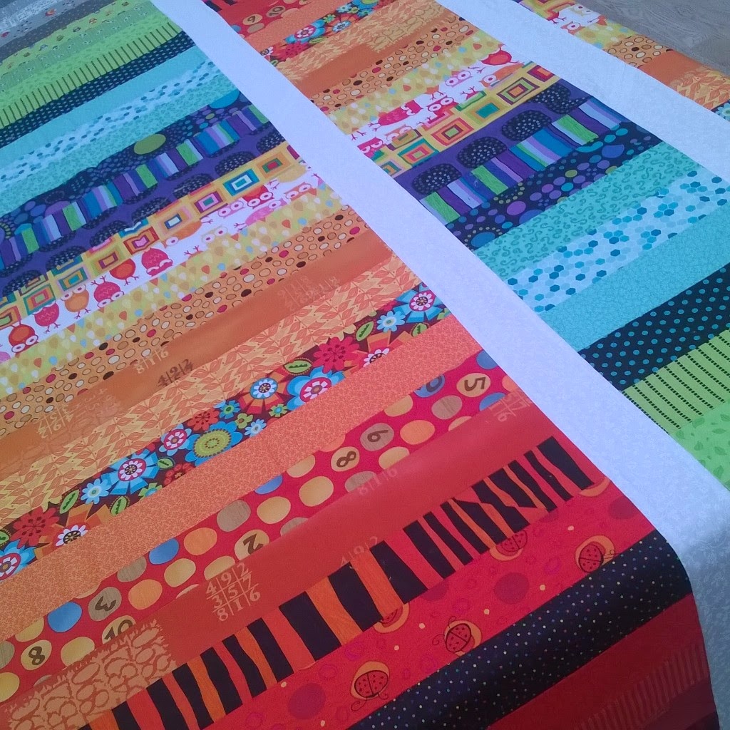 Jeg kan godt lide at mine bagsider passer til forsiderne; dvs. hvis jeg har syet et tæppe i reproduktionsstoffer, så vil jeg også gerne have denne type stoffer på bagsiden af mit tæppe ... helst i farver og design, der passer til forsiden. Det samme gælder, hvis jeg har syet et mere moderne tæppe, som "regnbue" tæppet jeg har lavet til Magnus. Dette tæppe er forøvrigt lavet efter en tutorial hos Clock Clock sew. "Strip and Flip" kalder hun tæppet, som egentlig er et barnetæppe. Jeg har blot lavet det bredere og længere.