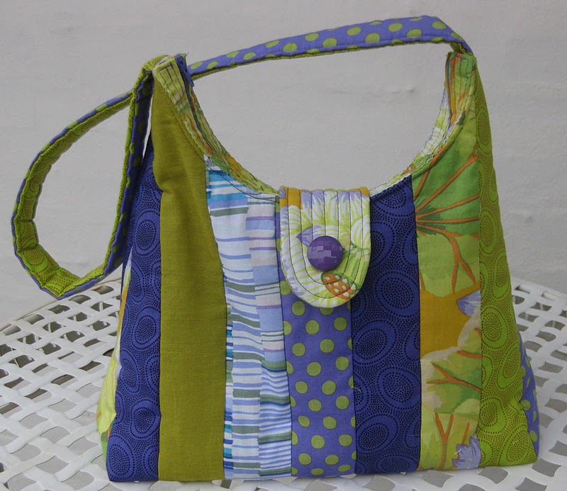 Denne "Pretty Blue" (godt navn, men den er vist mere blåviolet og gulgrøn sagde farelærerinden) er syet af Anne Mette (non-blogger), sød kunde og kursist, der kommer hos mig. Hun købte en fin pakke stoffer på træf, som hun lige tænkte kunne bruges til denne taske ... og den er da bare blevet fin.Taskerne kan syes af Jelly Rolls eller "bare" af restestrimler. De er fine uanset.