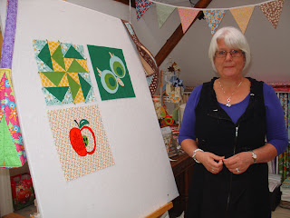 Vi starter altid med en "Show & Tell", hvor vi viser vores blokke frem og fortæller lidt om arbejdet med dem. Der er altid mange tanker bag blokkene. Herover er det Anne, der viser sin fortolkning af 3. udfordring som gik på at sy noget, der var naturalistisk, figurativ og/eller billedligt. Mindst én af blokkene SKULLE være et dyr og man måtte også gerne sy traditionelle pw-blokke, hvis der indgik et dyr i deres navn.