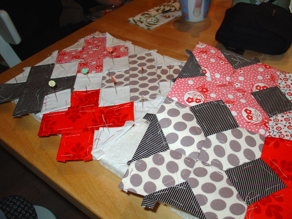 Jeg har været ret så optaget af at sy til kurser det sidste stykke tid ... men har jo svært ved at lade være med at lege med. Denne gang havde jeg dog EN SMULE at vise frem idet jeg havde én helt færdig blok med, Five Cross (blokken til venstre her under) og en halvfærdig sat op på min flamingoplade, Redd Cross (blokken til højre, herunder).. og så må vi jo se om de ikke får følgeskab af andre hen af vejen.
