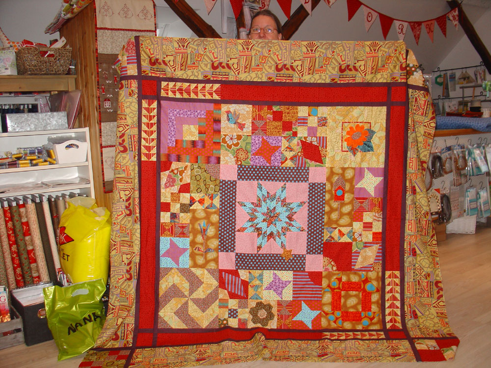 Pia, som har været med til alle de forudgående omgange af Design Udfordringen, medbragte færdig top. Sidste års DU var en såkaldte "Pusle-quilt" (forskellige blokke i forskellige størrelser), som skulle pusles sammen bagefter, og basispaletten var hovedsagelig Kaffe Fasset stoffer. Jeg synes den er blevet SUPERFLOT.