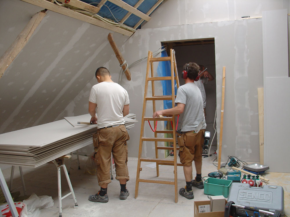 og her et kig ind til fotografen, hvor håndværkerne har travlt. Kun en dør vil skille min butik og hans studio ... and here a view to my husbands future photo studio, only a door will seperate our working spaces.