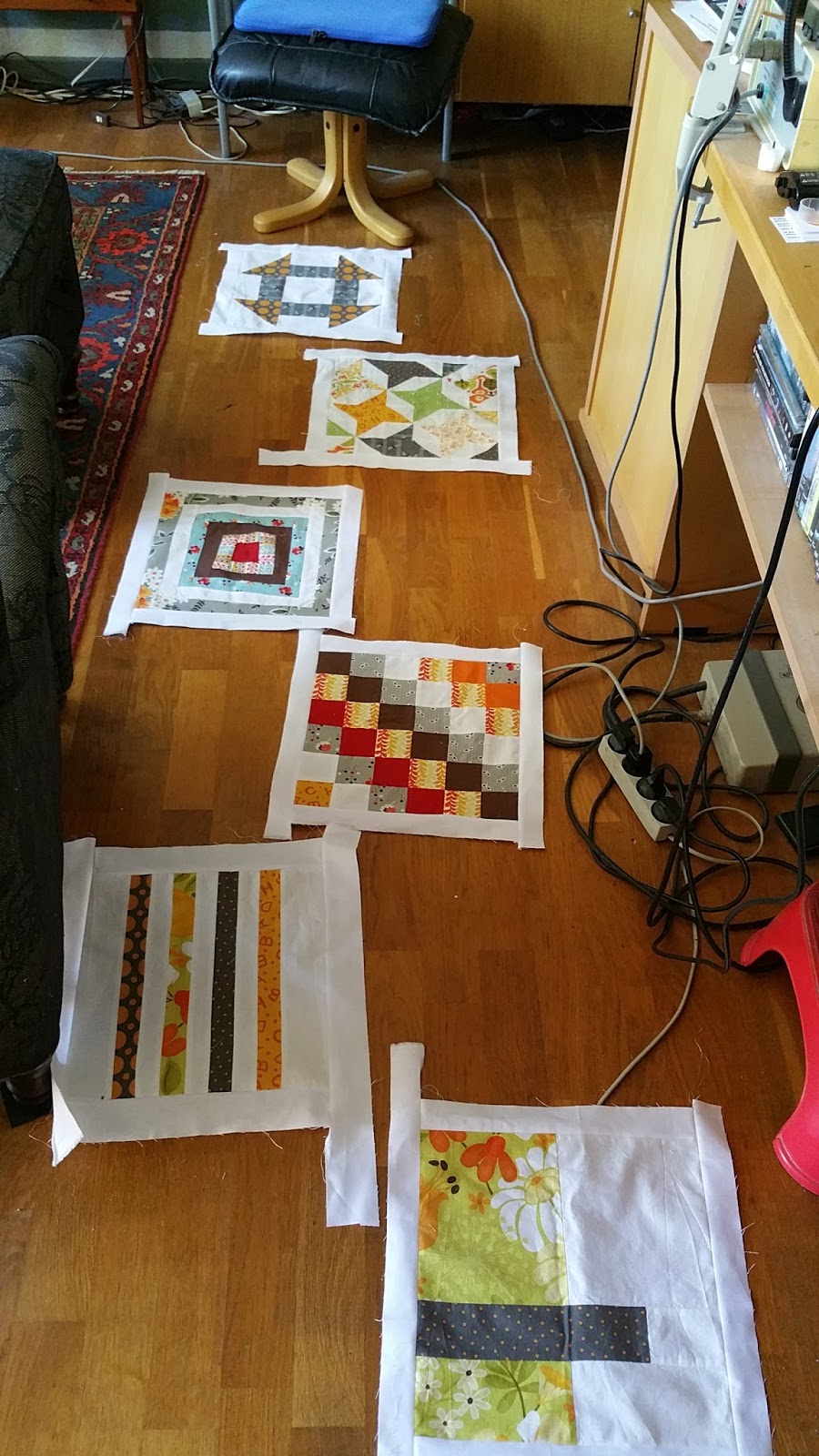 Først syede jeg disse orange rammer omkring blokkene. Dernæst syede jeg mellemstykker med "stolper" imellem blokkene. Således fik jeg 2 rækker/baner med henholdsvis 3 og 4 blokke, forbundet lodret af rødorange stolper.