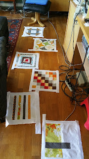 Så i min sommerferie fik jeg så rigtig travlt med at få noget færdigt, der kunne kvalificere sig til at deltage i denne udstilling ... og dermed fik jeg ideen til at tage mine DU2012 blokke frem igen. Igen opgav jeg tanken om at sy flere blokke til en sampler, men fik en (synes jeg selv) ret god og meget moderne idé, hvor jeg kunne nøjes med de 7 blokke, jeg havde. En hurtig skitse og så var jeg igang...