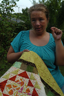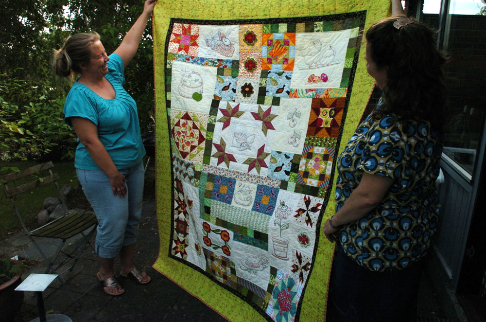En dejlig sommeraften kom søde Maria forbi med et projekt, hun havde quiltet for mig, tæppet "I haven". Som de fleste sikkert ved er Maria lidt af en tryllekunstner med en symaskine