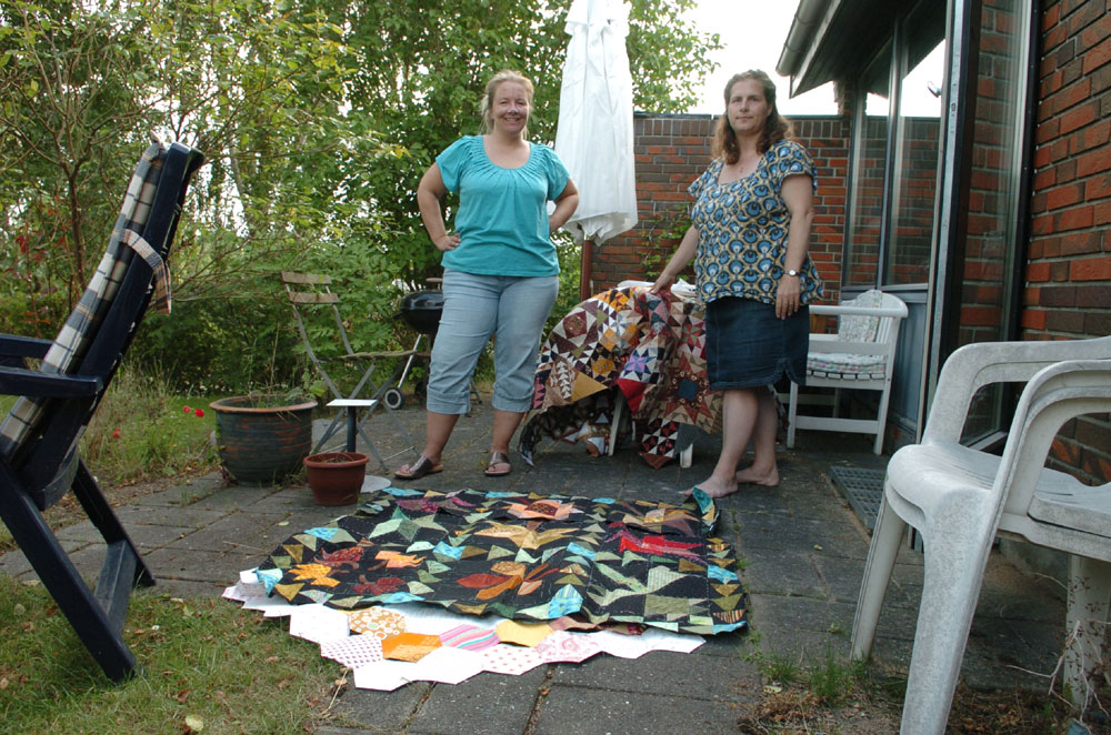 Da det var en dejlig lun sommeraften (og huset forøvrigt så lille, at bare én ekstra person er én for meget) trak vi udenfor, så vi rigtig kunne kigge på "sagerne". Det kom der nogle sjove billeder ud af, mens Maria fortalte om sine overvejelser og oplevelser omkring quiltningen af mit tæppe: