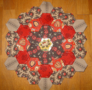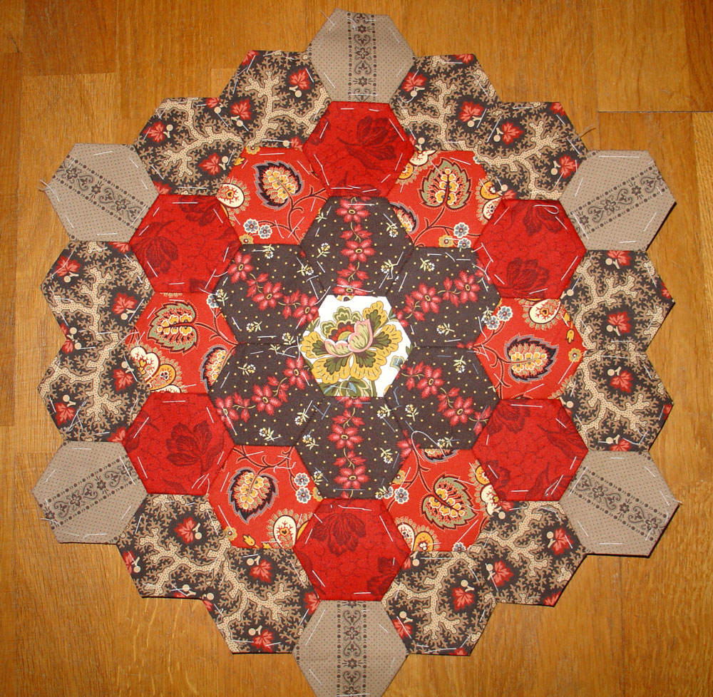 som nu har ligget mere eller mindre stille siden min sommerferie. Det er ellers et projekt, man skulle mene, man hurtigt kunne blive færdigt med; hexagonerne har et sidemål på 3". Jeg bruger bla. en del fine stormønstrede designerstoffer, som kan være vanskeligt at få sig til at klippe i alt for små stykker. Ideen fik jeg fra en antik quilt og jeg synes det var alletiders lejlighed til at få brugt nogle af resterne fra Stephanies sengetæppe