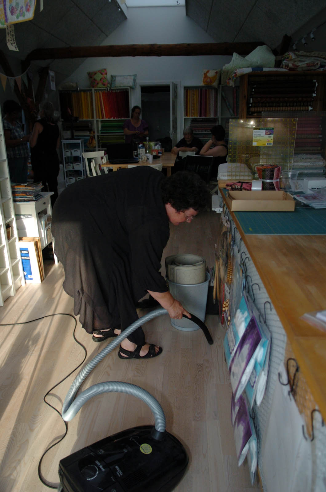 Da alt var båret ned og butikken en anelse mere tom end normalt, gik mor Karin lige i gang med støvsugeren.