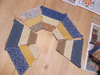 På første mødegang i april fik kursisterne 2 mønstre, en 50x50 cm Dresden Plate pude og en variation over den traditionelle "spiderweb" blok, på 40 x 40 cm.