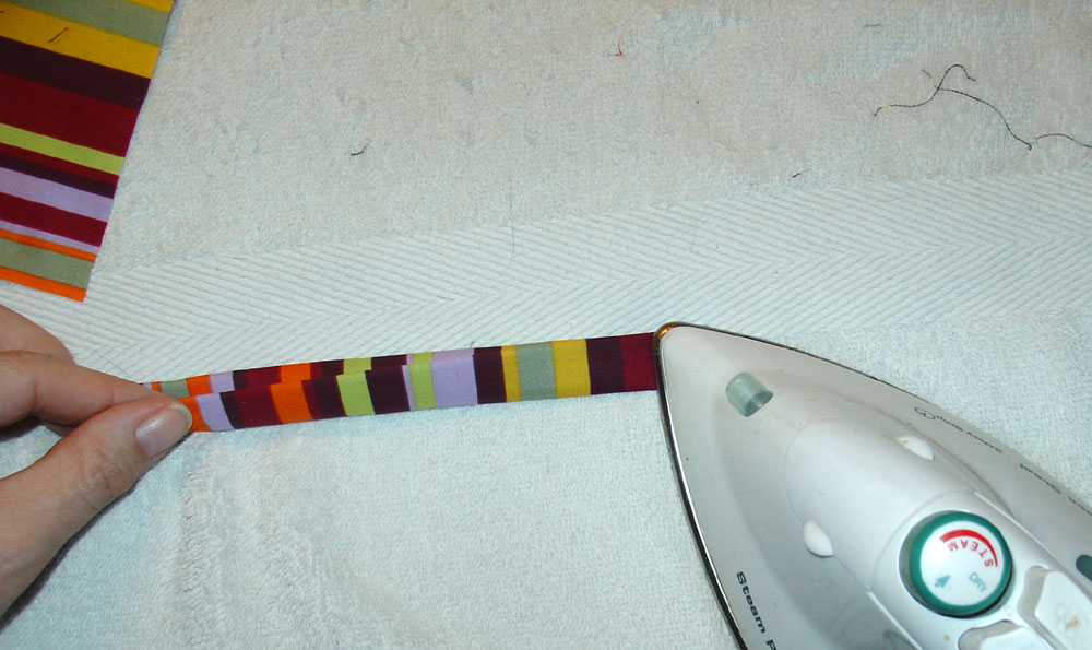 - Når strimlen er syet fast, foldes den ud og fingerpresses på plads, hvorefter den næste strimmel lægges på og syes fast på samme måde. Fortsæt således, indtil du har dækket hele den ene side af grydelappen, hvorefter du vender grydelappen og gør det samme med på den anden side af midterstrimlen.