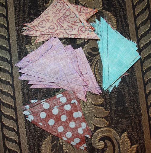 Jo, en hel masse HST. Metoden jeg har brugt til a sy efter er nem; når man kender den FÆRDIGE størrelse på de kvadrater (der består af 2 trekanter), man vil lave (i dette tilfælde 2"), så lægger man 7/8 til dette mål = 2 7/8". Kvadrater skæres i dette mål i de farvekombinationer man ønsker. Derefter tegner man en streg på de lyseste kvadrater diagonalt (fra hjørne til hjørne). Kvadraterne lægges ret mod ret og man syr på på hver sin side af den påtegnede streg med trykfodsbredde (inch-trykfod naturligvis). Dette kan gøre som kædesyning, hvor man ikke bryder tråden. Dernæst klipper/skærer man i den påtegnede streg og vupti har man en masse HST, som på billedet herover. Jeg har brugt en tutorial til mine HST fundet her. HST kan bruges til en masse flotte ting; mine blev bl.a. til nogle små windmill blokke til Design Udfordringen.