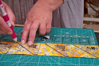 I dag lørdag var Pia på besøg og give en demo af, hvordan man ikke "bare" kan bruge Jelly Rolls til tæpper og ting i strimmelteknik, men også kan sy flotte traditionelle blokke, selvom man "kun" har en 2,5" brede strimler. Inspirationen kommer fra bogen "Jelly Roll Sampler Quilts"