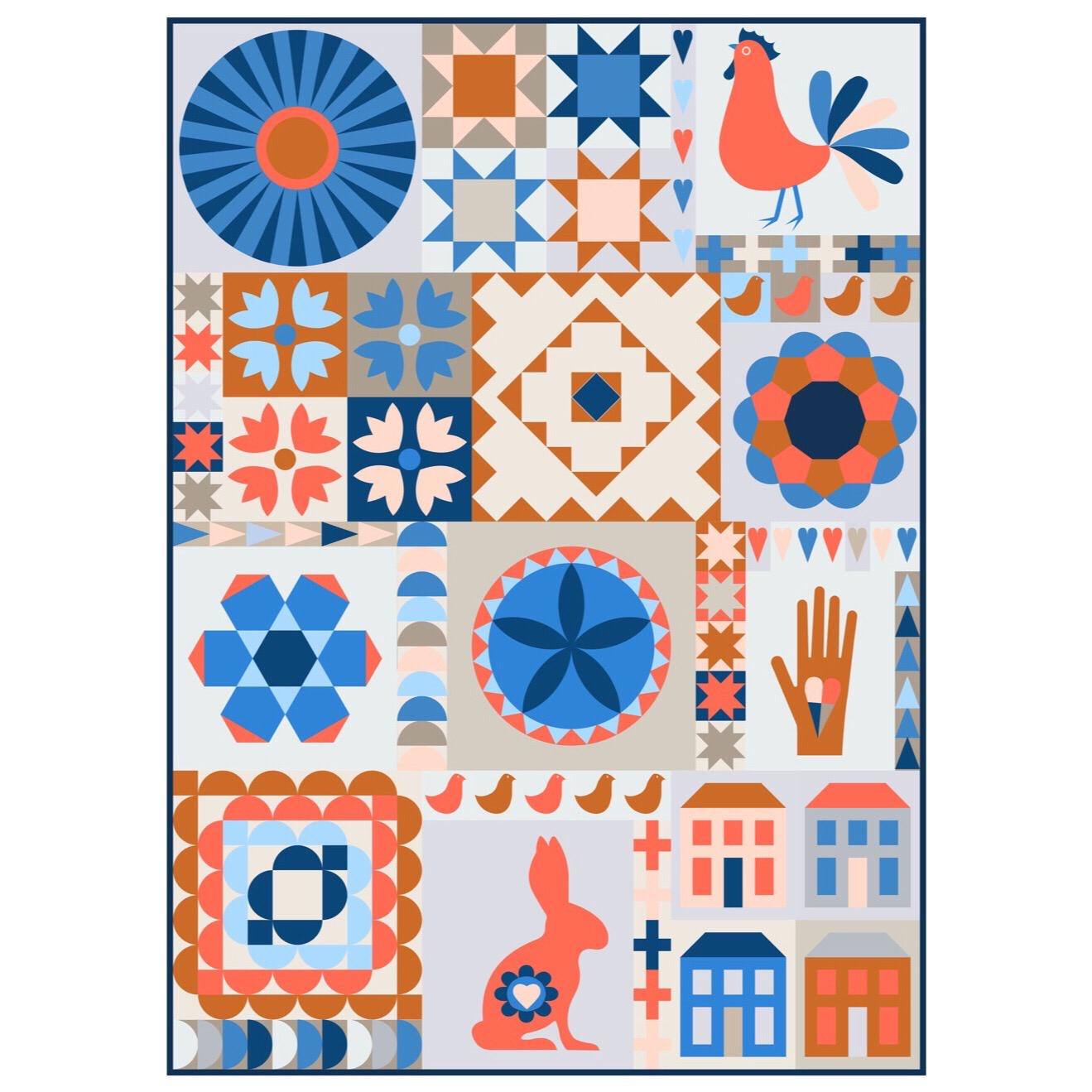 Quilten måler 60" x 84" (ca. 150 cm x 210 cm) og indeholder både syede og applikerede blokke, som for mange af dem kan syes både i hånden og på maskine. Du kan læse mere på deres egen side!