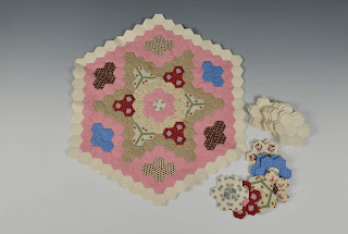 I første pakke skal man sy en af de 4 hjørnestjerner, som man også kan se et glimt af på fotoet af den originale coverlet længere opppe i teksten. Desuden skal der syes 20 farvede hexagon blomster og 20 lyse hexagon blomster som skal bruges til kanten. Dette har vi planlagt at man skal gøre i hvert af de i alt 10 BOM pakker man modtager for at fordele arbejdet lidt (lidt ligesom vi gjorde til Mrs. Billings da den var BOM). Hexagonerne, der bruges her er 3/4" i sidemål (ca. 2 cm) og der er over 3000 af dem, så dette er en typisk engelsk mosaik quilt.