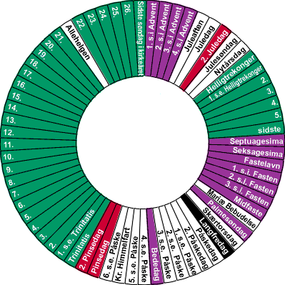 Kirkeåret begynder den første søndag i advent og slutter den sidste søndag efter trinitatis. Hver søndag og helligdag har sit særlige indhold, for eksempel Jesu fødsel, død og opstandelse, Helligåndens komme, og så videre. Til kirkeårets forskellige perioder er der også knyttet en række farver. Disse liturgiske farver, som de også kaldes, er ofte fremstillet i en farvecirkel.