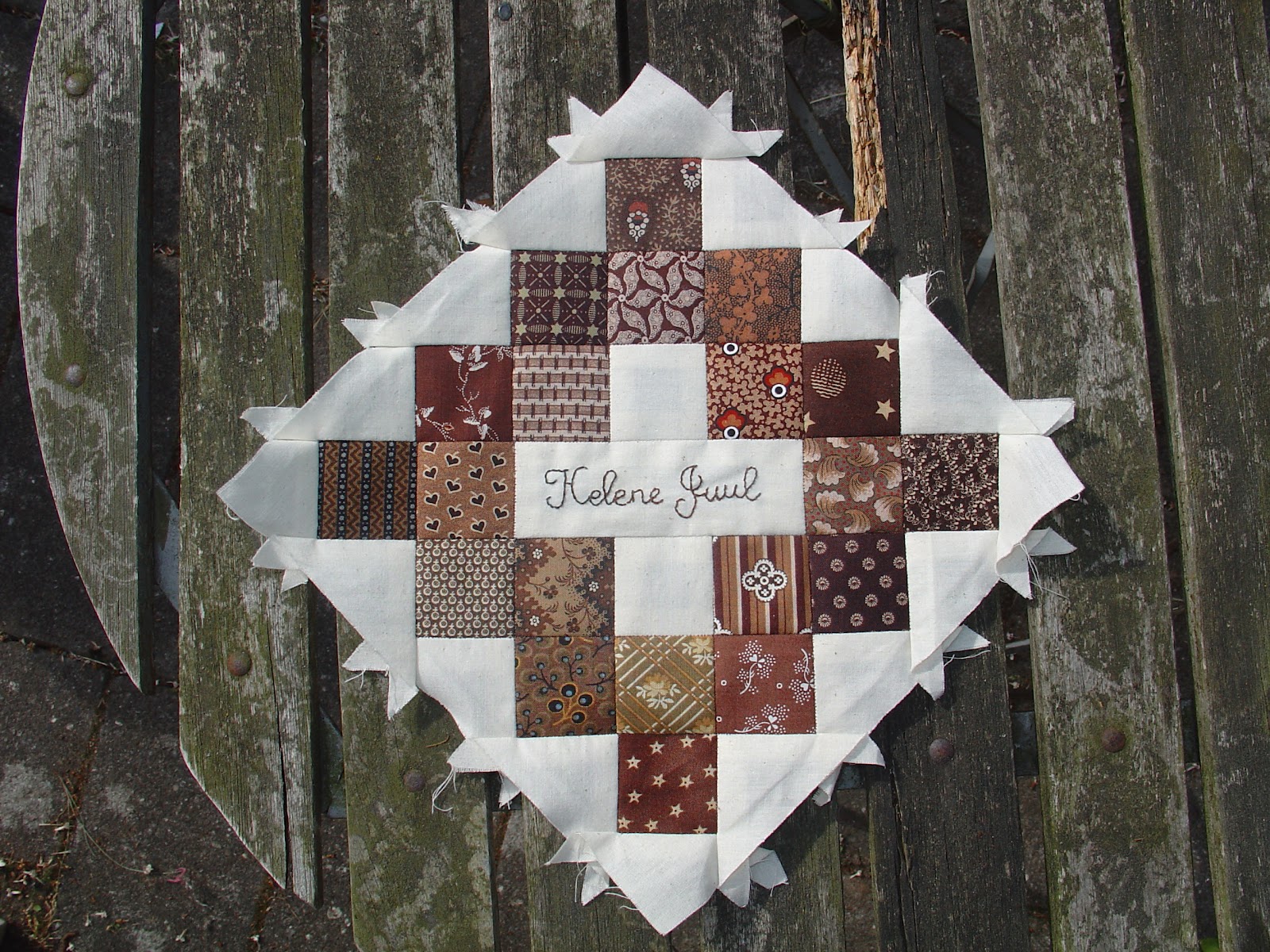 Vi havde besluttet os for at det skulle være brune og double pink 1800-tals reprostoffer på lys/shirting baggrund, og at de skulle være blokke med broderet eller skrevet navn, så Pias kunne se, hvem som havde deltaget. Nanny, Karin, Maria og jeg mødtes en søndag og planlagde designet på quilten og begyndt at sy den sammen. Vi besluttede os for et klassisk medaljon layout og valgte et meget flot stormønstret brunt stykke stof til en stor sekskantet midterblok samt til kant og den yndigste doublepink stribede som rammer omkring midten og som ”sashing” imellem rækkerne. Karin tog toppen med hjem og syede den færdig i sin ferie, og vi mødtes så igen en anden søndag og lavede quiltsandwich i butikken (hele tiden var vi nervøse for at Pia skulle dukke uanmeldt op og opdage, hvad vi var i gang med).