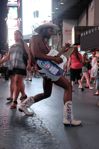 og hvor alskens underlige personer samles hver aften for at se og ses. Som f.eks. denne unge mand her, som kaldte sig "The Naked Cowboy"
