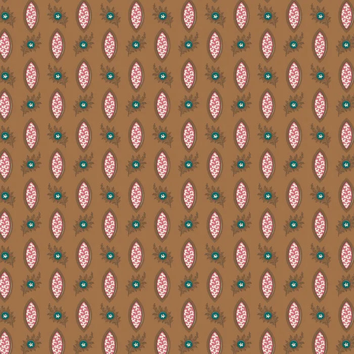 Printet Reuben er mellembrun/karamelfarvet i bunden med et fladedækkende print af ovaler i rosa og hvid (måler ca. 1,5 x 2,8 cm) og grene i mørk brun med en grøn cirkel med en hvid blomst. Disse prints er printet "a la foulard", hvilket betyder i diagonale rækker henover stoffet. Der er ca. 3 cm imellem ovalerne vandret.