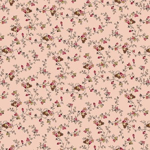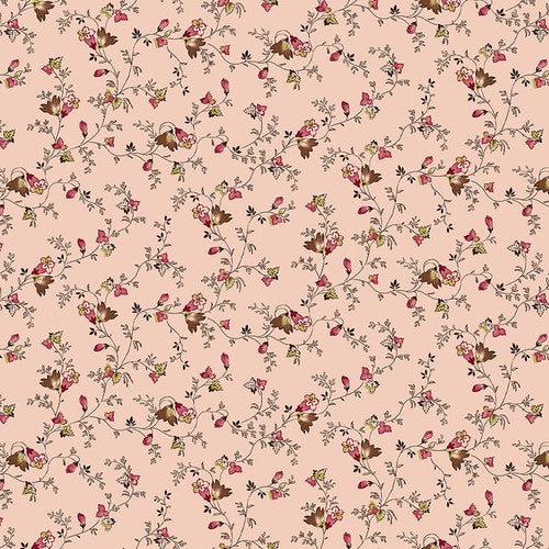 Dette stof, Dainty vines, er svag rosa i bunden med et fladedækkende lille print af fine grene med små blomster. Et meget yndigt print.
