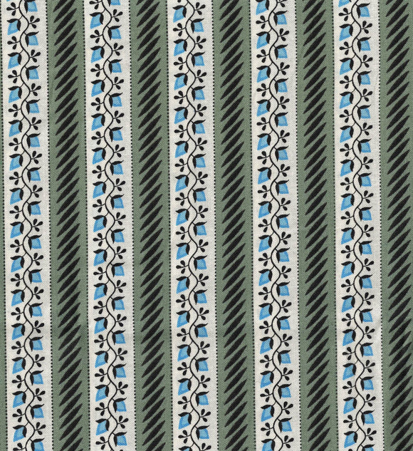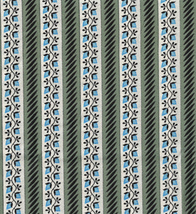 Dette stof er en rigtig fint stribe med en vintage feel; der er en ca 2 cms råhvid stribe med et slyngende blomsterprint i sort og klar blå og et en ca. 1,5 cm bred armygrøn stribe med et sort print.