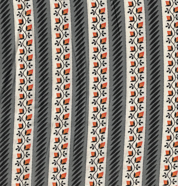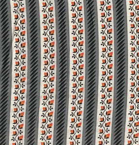 Dette stof er en rigtig fint stribe med en vintage feel; der er en ca 2 cms råhvid stribe med et slyngende blomsterprint i sort og orange og et en ca. 1,5 cm bred grå stribe med et sort print.