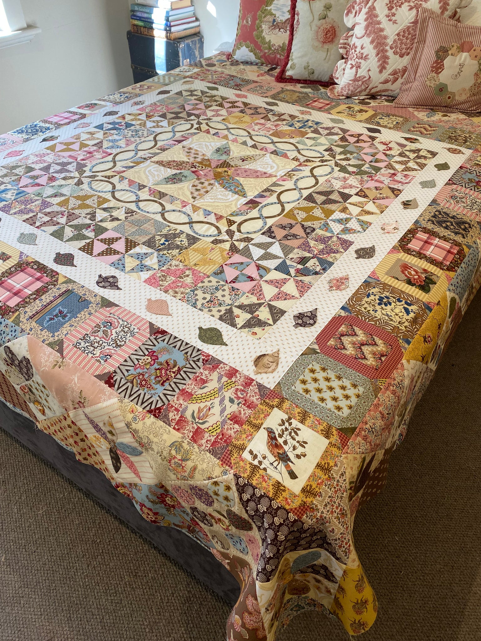 Hvad der svarer til ca. 3 - 3,5 meter "rester" af stof med print. Vær obs på at der både er medium og mørke valører. Jenny har hovedsagelig brugt pink, blå, gyldent, en smule violet og adskillige nuancer af karamel, beige og chokoladebrune stoffer, da hun gik efter en bestemt "vibe", der signaliserede blødt, engelsk north country. Jenny har brugt 1800-tals reproduktionsstoffer, men der er ikke noget i vejen for at køre en helt anden farve- og stofstil, hvis det ikke er noget for dig.