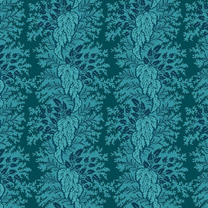 Dette stof er mørk turkis/blågrøn i bunden med et fladedækkende tone-i-tone serpentine print i lysere turkis/blågrøn. Betegnelsen "serpentine" betyder slange ... og det er netop hvad dette stribeprint gør; slanger sig henover stoffet.